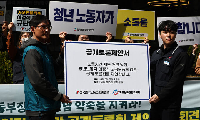양대 노총이 ‘장시간 근로’ 논란을 부른 근로시간 제도 개편안과 관련해 공개 토론을 하자고 이정식 고용노동부 장관에게 제안했다.