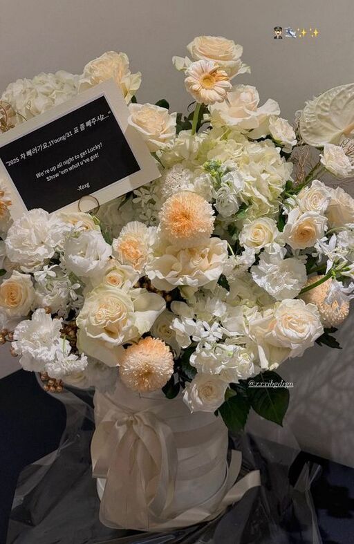 꽃 장식에는 "2025 차 빼러 가요. 1Young/31 표 좀 빼주시Z"라는 쪽지가 함께 붙어 있어 눈길을 끌었다.