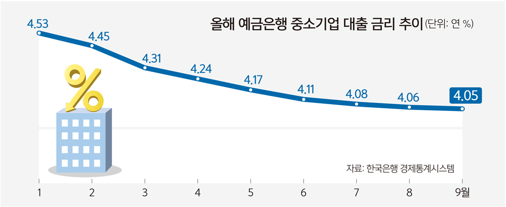 12일 한국은행 경제통계시스템에 따르면 예금은행의 중소기업 대출 금리는 9월 신규취급액 기준 연 4.05%로 집계됐다. 5월 4.17%에서 4개월 사이 0.12%포인트 감소했다. 2022년 5월(3.79%) 이후 3년4개월 만에 가장 낮은 수준이다. 연 4% 미만 대출 비중도 52.8%에 달해 2022년 6월(53.1%) 이후 가장 높았다.