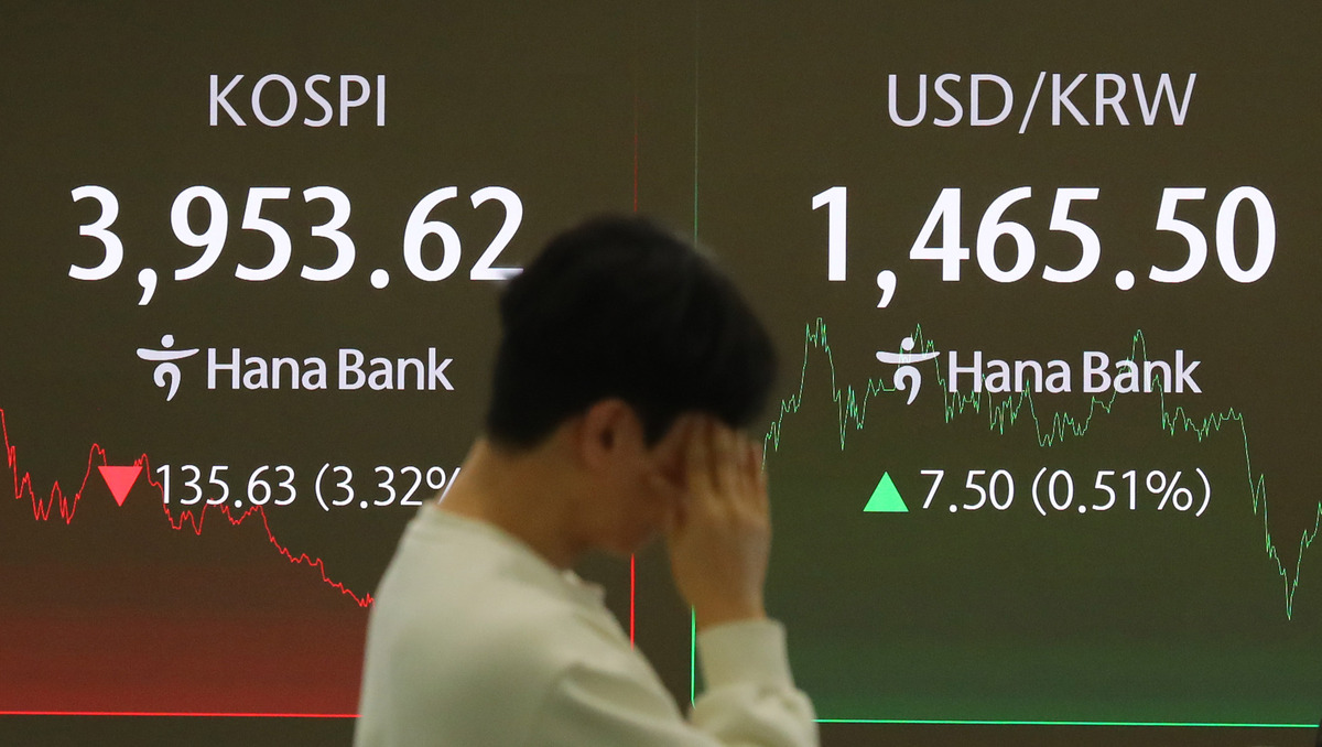 코스피가 전 거래일(4089.25)보다 135.63포인트(3.32%) 내린 3953.62에 마감한 18일 오후 서울 중구 하나은행 딜링룸 전광판에 지수가 표시되고 있다. 코스닥 지수는 전 거래일(902.67)보다 23.97포인트(2.66%) 하락한 878.70에 거래를 마쳤다. 원·달러 환율은 전 거래일(1458.0원)보다 7.3원 오른 1465.3원에 주간 거래를 마감했다. 뉴시스