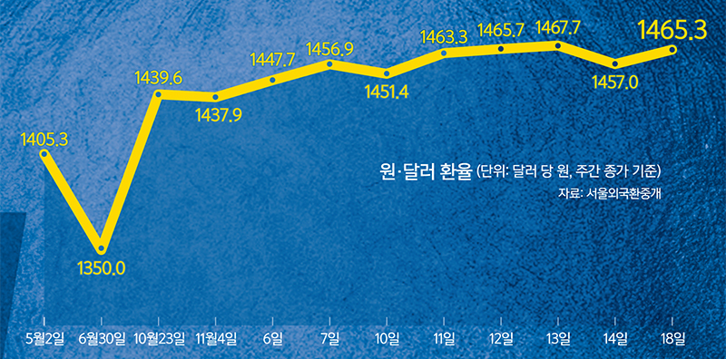 18일 서울외환시장에 따르면 달러 대비 원화 환율은 지난 13일 장중 1475.4원까지 오르며 7개월 만에 최고치를 기록했다. 다음날 외환 당국이 구두 개입에 나선 후 1450원대로 떨어졌지만 주말 이후 다시 오름세를 보이며 이날 전일 대비 7.3원 오른 1465.3원에 주간거래(오후 3시30분)를 마감했다.