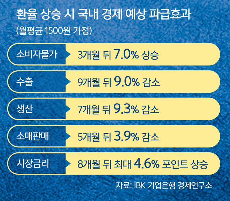 박형중 우리은행 이코노미스트는 “연내 1430∼1480원 박스권을 예상하지만, 연준 금리 인하 기대가 후퇴하거나 도널드 트럼프 행정부 관세·규제 위험이 재부각되면 1500원 선을 터치할 가능성이 있다”고 전망했다. 환율 1500원이 우리 경제에 미칠 악영향은 생각보다 심각하다. IBK 기업은행 경제연구소는 올해 초 발간한 ‘환율상승 시 국내경제 파급효과 분석’ 보고서에서 월평균 환율이 1500원까지 오르면 소비자물가는 3개월 뒤 최대 7.0% 상승할 수 있다고 분석했다. 반면 수출은 9개월 뒤 최대 9.0% 감소, 생산도 7개월 뒤 최대 9.3%가 감소할 것으로 내다봤다.