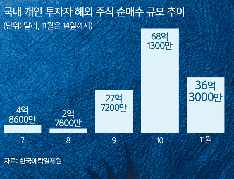 최근 환율 상승의 가장 큰 이유로는 일명 ‘서학개미’들의 해외투자 증가가 꼽힌다. 한국예탁결제원에 따르면 이달 들어 14일까지 국내 개인 투자자의 해외주식 순매수는 36억3000만달러, 일평균 2억6000만달러를 기록했다.