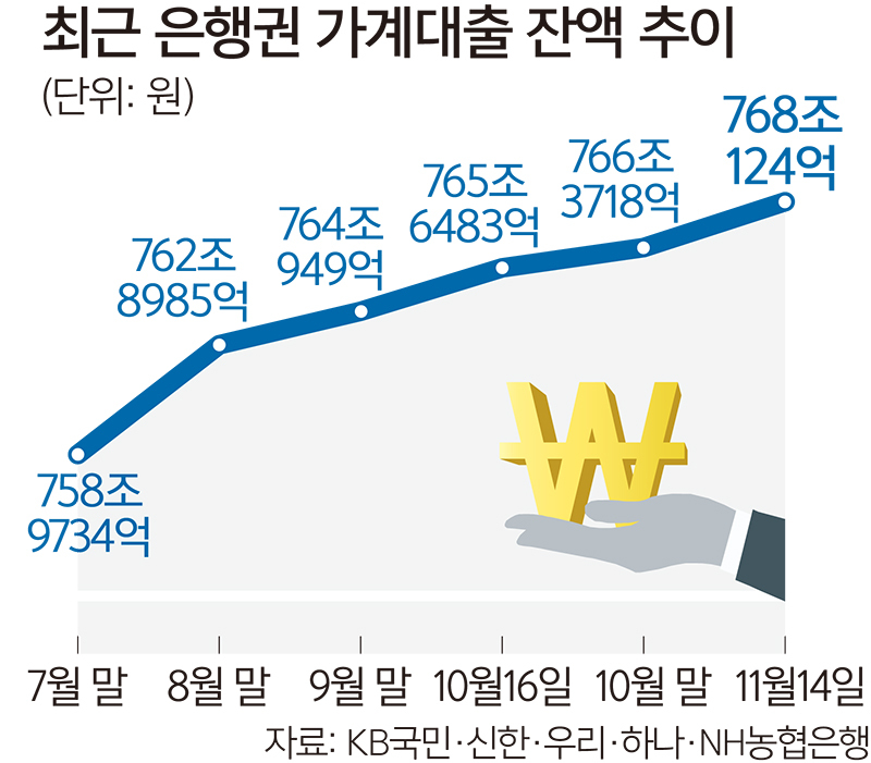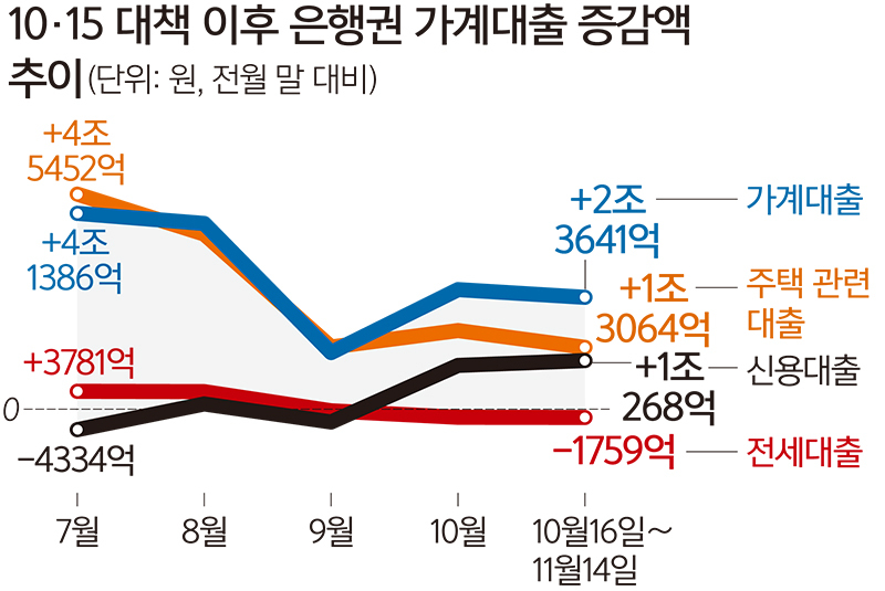 18일 세계일보가 5대 은행(KB국민·신한·하나·우리·NH농협)으로부터 받은 자료에 따르면, 전체 가계대출 잔액은 대책 발표 직후인 지난달 16일 765조6483억원에서 이달 14일 768조124억원으로 2조3641억원 증가했다. 10월 증가액(2조5270억원)보다도 소폭 줄었고, 부동산 ‘영끌’(영혼까지 끌어모아 주택구입)이 활발했던 6월(6조7536억원)과 비교하면 3분의 1 수준으로 증가세가 둔화했다. 6·27 부동산 대책이 나온 후인 7월(4조1386억원)과 8월(3조9251억원)보다도 적었다.