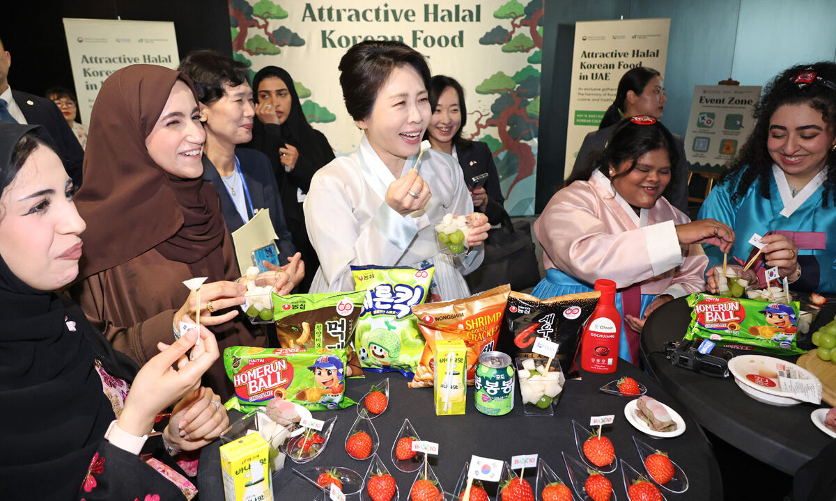 김 여사는 이날 아부다비 주UAE 한국문화원에서 열린 ‘할랄 인증 K푸드 홍보 행사’에 참석했다. 할랄은 무슬림이 섭취할 수 있도록 도축·가공·조리 전반에 이슬람 방식이 적용된 음식을 가리킨다. 김 여사는 한국농수산식품유통공사(aT) 부스를 방문해 할랄 인증을 받은 한우 등심구이에 관해 설명을 듣고, 현지에서 한국 딸기를 재배하는 업체 관계자와 대화하기도 했다.