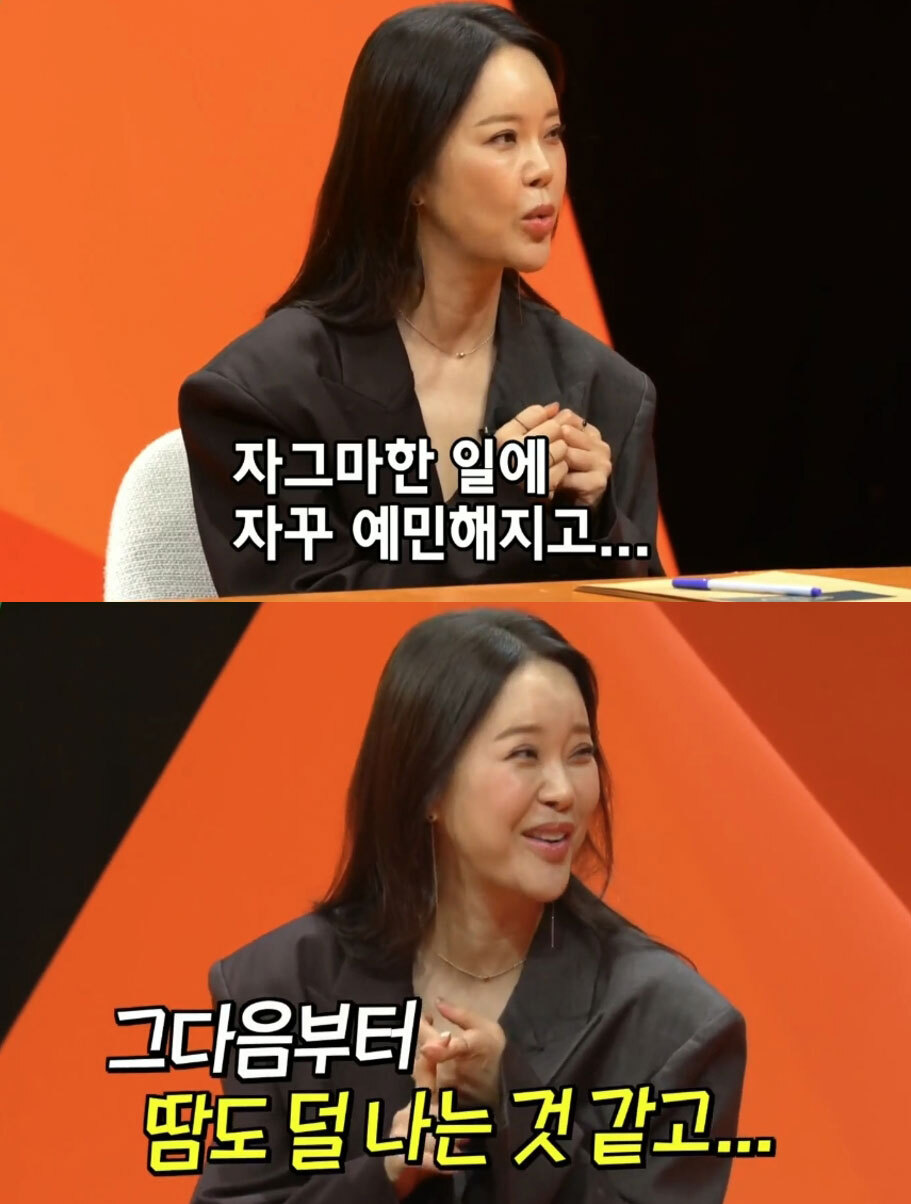 대신 그는 지인에게서 ‘갱년기 자가 진단 키트’가 있다는 말을 듣고 직접 구매해 검사해 봤다고 밝혔다. “저보다 2살 많은 언니가 알려줘서 그날 바로 키트를 샀다. 세 개나 사서 검사해 봤더니 (갱년기가) 아닌 걸로 나왔다”는 그는 “그다음부터 땀도 덜 나고, 화도 안 나더라. 몸이 좀 가뿐해지는 느낌이었다”고 말해 웃음을 자아냈다.