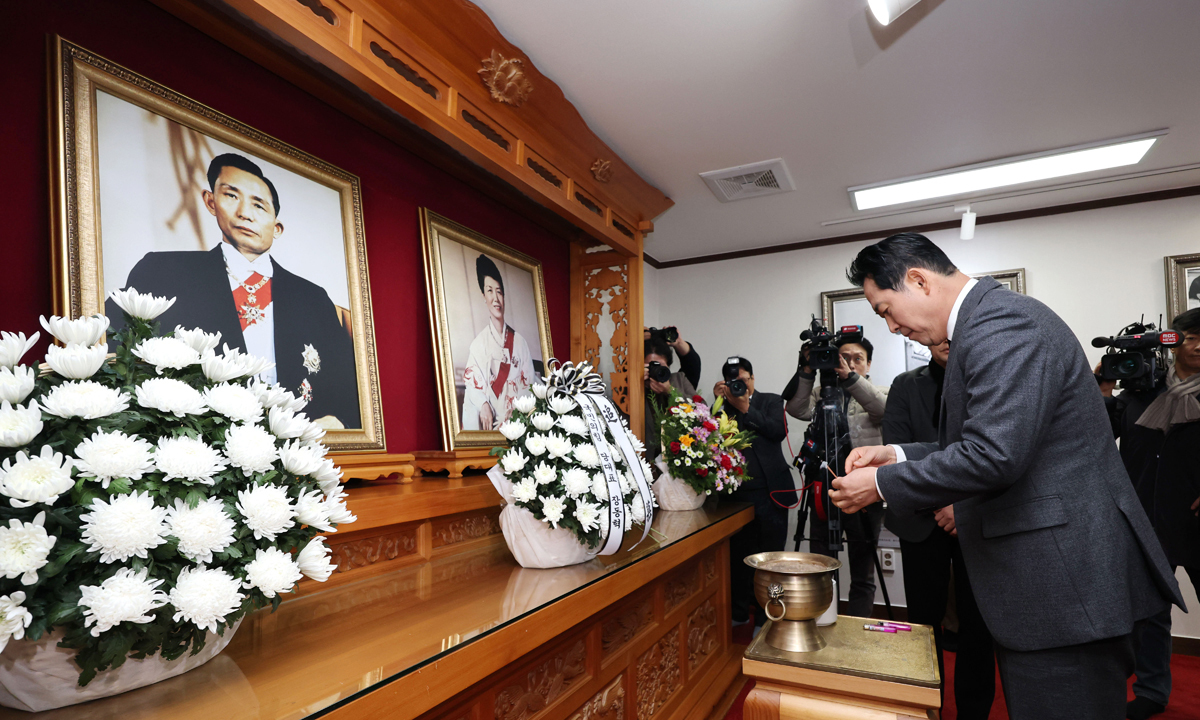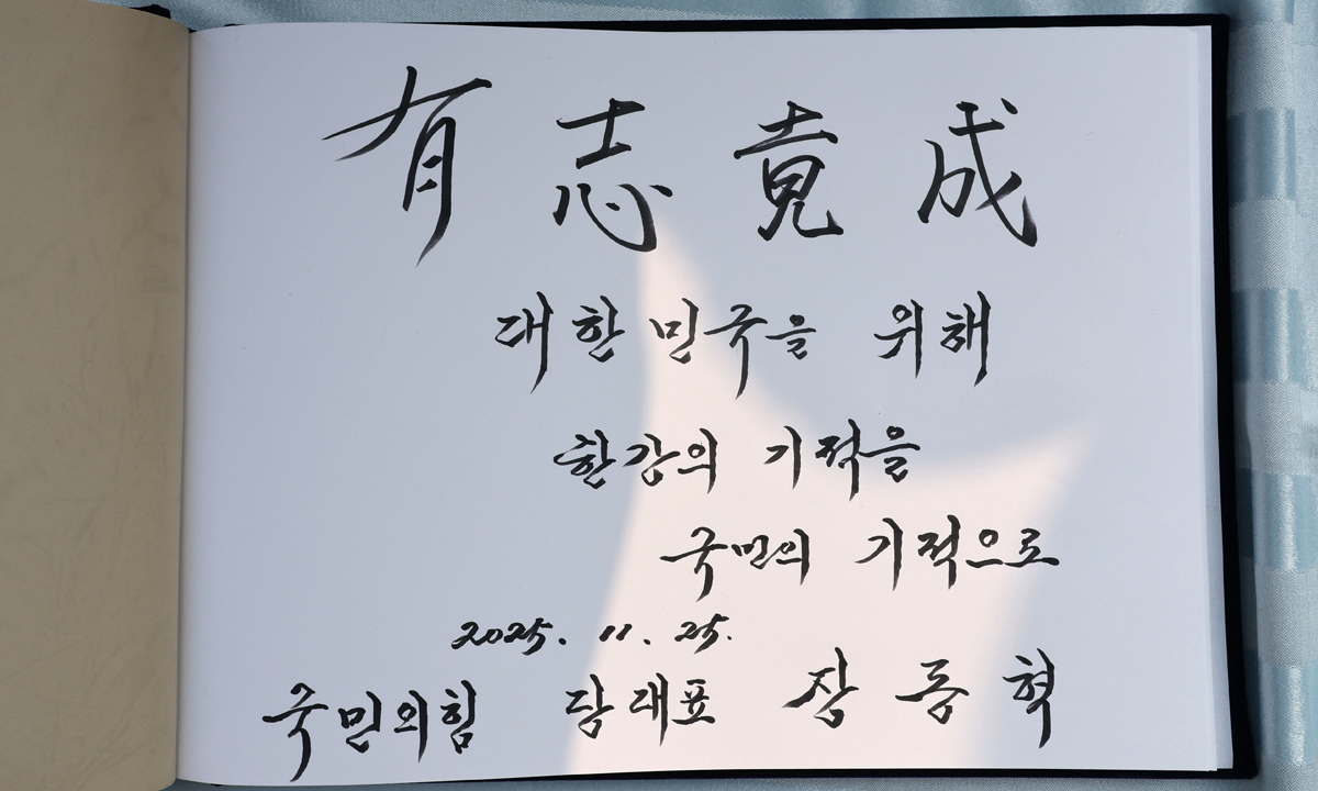 25일 경북 구미시 박정희 대통령 생가를 찾아 참배한 국민의힘 장동혁 대표는 방명록에 이같은 사자성어와 함께 ‘대한민국을 위해 한강의 기적을 국민의 기적으로’라고 적었다. 12·3 비상계엄 1주기를 앞두고 장 대표는 계엄에 대한 사과와 지방선거 대비 대여투쟁 노선 전환을 요구하는 당내 압박에 직면해 있다.