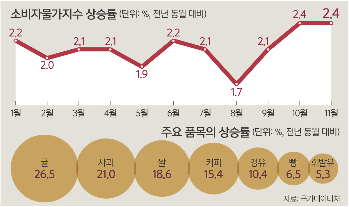 2일 국가데이터처가 발표한 ‘11월 소비자물가동향’에 따르면 지난달 소비자물가지수는 117.20(2020=100)으로 전년 동월 대비 2.4% 올랐다. 올해 소비자물가 상승률은 1월에 2.2%로 출발한 뒤 줄곧 1% 후반∼2% 초반을 오르내렸다. 한국은행의 물가안정 목표치인 2%에 인접한 수준을 유지한 셈인데, 10월에 2.4%로 크게 오르더니 2개월 연속 2% 중반에 머물러 있다.