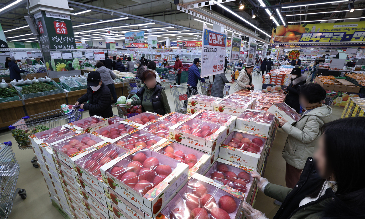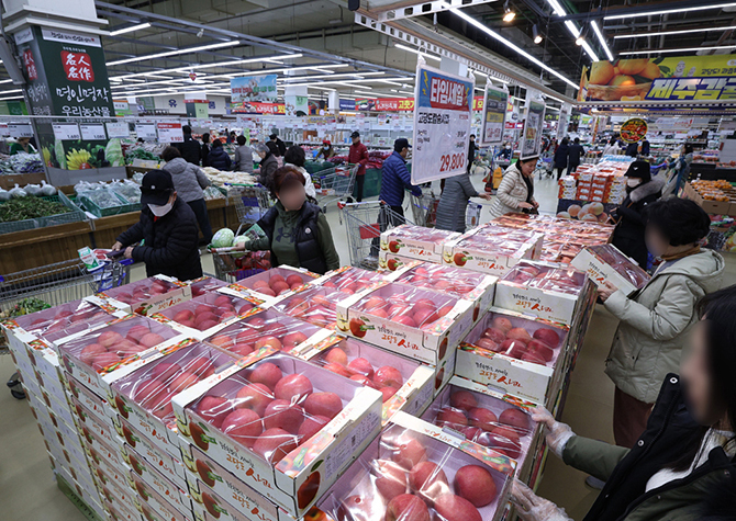 선뜻 손 안 가는 사과 가격 2일 서울 시내 한 대형마트에서 시민들이 진열된 사과를 살펴보고 있다. 국가데이터처에 따르면 지난달 귤(26.5%), 사과(21.0%), 쌀(18.6%) 등의 가격이 급등하며 농축수산물 물가가 5.6% 뛰었다. 남정탁 기자