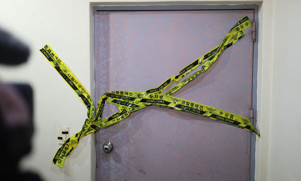 3일 오후 경남 창원시 마산회원구 합성동 한 모텔 계단에 경찰 통제선이 설치돼 있다. 연합뉴스
