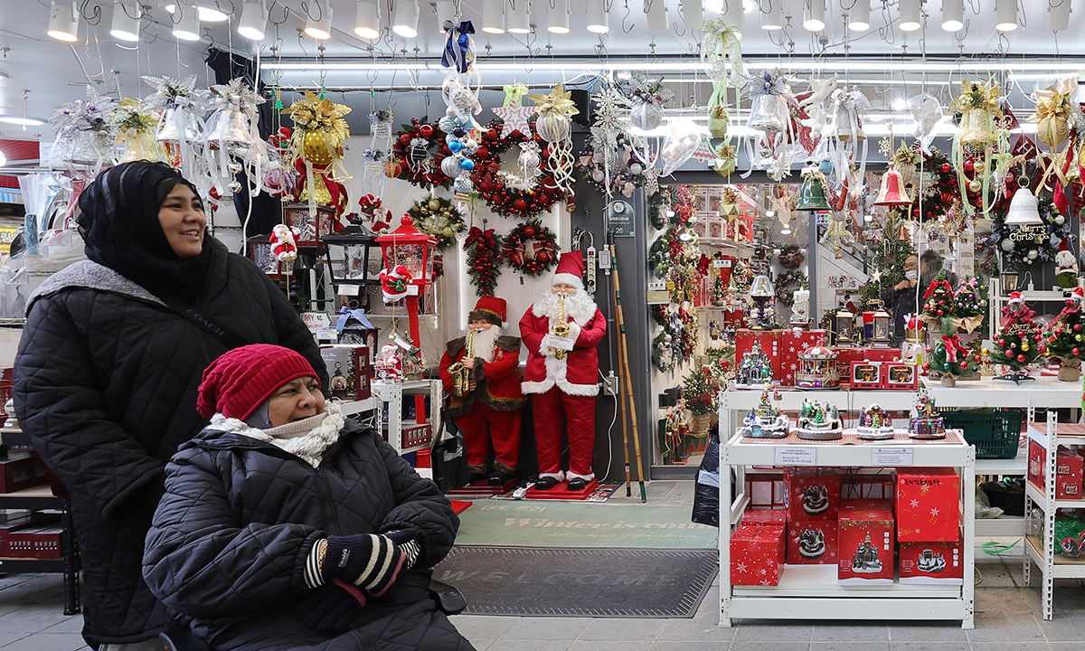 서울 남대문시장, 크리스마스 장식으로 가득 찬 가게 앞에서 외국인 관광객이 장식품을 보며 웃음을 보이고 있다.