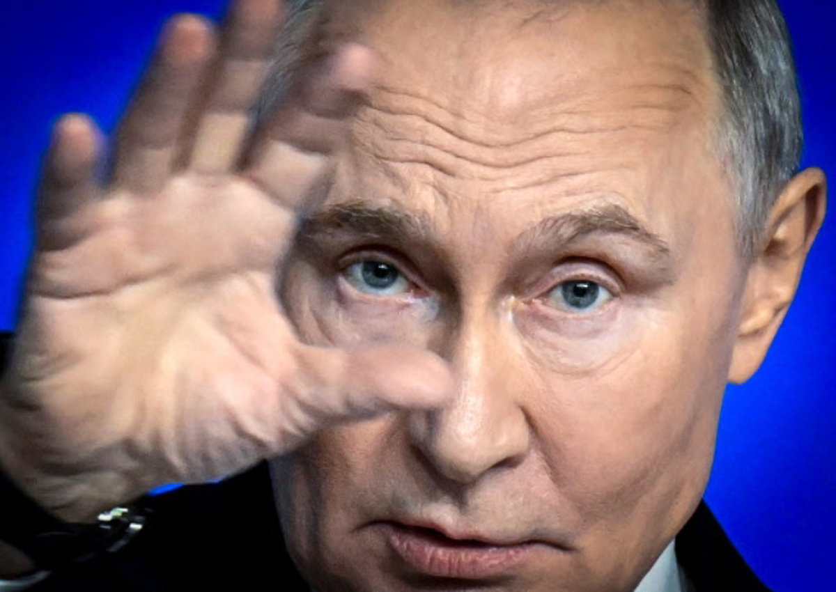 블라디미르 푸틴 러시아 대통령이 19일(현지시간) 연례 기자회견 도중 손바닥을 들어 보이는 제스처를 취하고 있다. AFP연합뉴스