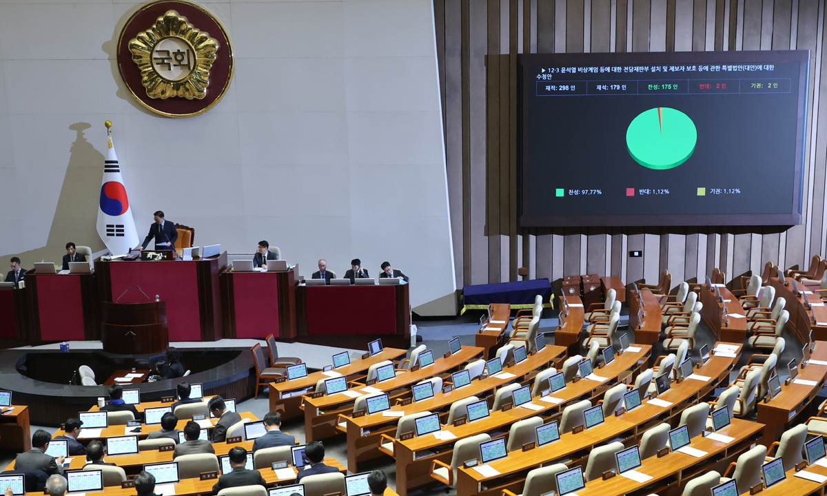 국회는 23일 본회의에서 ‘내란·외환·반란 범죄 등의 형사절차에 관한 특례법안’, 이른바 내란전담재판부 설치법을 가결했다. 179명이 표결에 참석해 찬성 175표, 반대 2표, 기권 2표로 가결됐다. 개혁신당 천하람·이주영 의원이 반대했으며 민주당 박주민 의원과 무소속 최혁진 의원이 기권했다.
