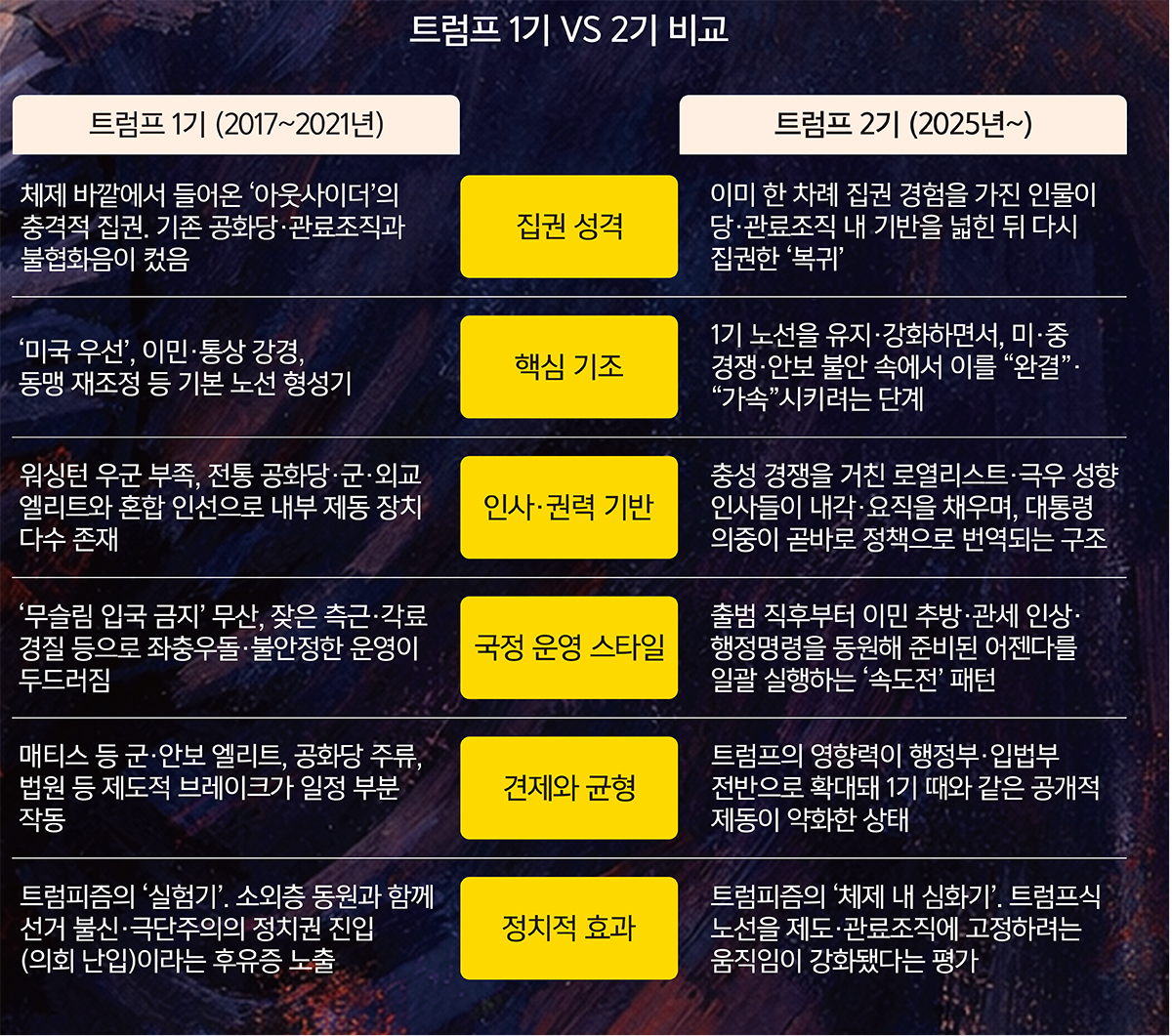 트럼프 2기의 내용은 1기와 크게 다르지 않지만 운영 방식은 1기에 비해 훨씬 정교하고 공격적이라는 평가다. 첫 임기 때는 워싱턴 주류 관료와 군·외교 엘리트가 곳곳에서 브레이크를 걸었다면, 지금은 충성 경쟁을 거쳐 선별된 측근·극우 성향 인사들이 내각과 요직을 채우면서 대통령 의중이 곧바로 정책으로 반영되고 있기 때문이다. 실제로 트럼프 2기 행정부는 출범 직후부터 이민 추방, 관세 인상, 행정명령을 동원한 규제 개편 등을 1기 때보다 훨씬 빠른 속도로 밀어붙였다. 국토안보부와 백악관 핵심 보좌진에 이민 규제 강경파와 1기 설계자들을 다시 중용해 대규모 불법 이민자 추방작전을 컨트롤타워 차원에서 총괄하도록 한 예가 대표적이다.