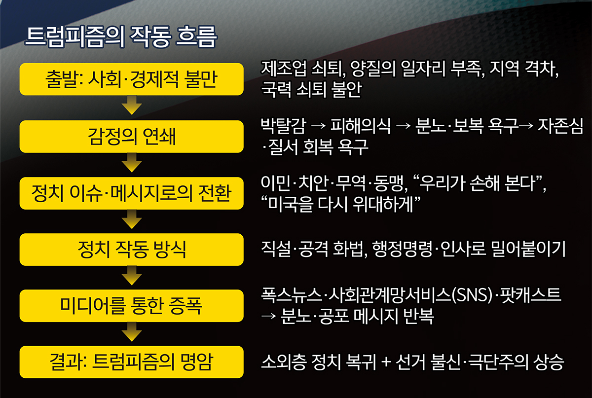 미국이 위상을 잃었고 세상이 불공정해졌으며, 그 과정에서 보통의 미국인이 희생됐다는 주장이다. 이 메시지는 쇠퇴한 러스트벨트와 시골·소도시 유권자들에게 상실감과 자존심의 회복 욕구를 자극했다. “나는 여러분의 전사이자 정의, 그리고 복수”라는 트럼프의 외침은 미국 사회에 축적돼 있던 분노와 질서 회복 욕구를 노골적으로 끄집어낸 것이었다. 박인휘 이화여대 국제학부 교수(학장)는 “트럼피즘의 작동을 가능케 한 핵심 동인은 세계화에 대한 시장의 실패, 그리고 시장의 실패에 효과적으로 대응하지 못한 국가의 실패, 두 가지로 꼽을 수 있다”면서 “트럼피즘은 미국 중산층의 경제적·이념적 패배감을 트럼프라는 정치 신인이 정치 이데올로기로 전환한 하나의 신념체계 및 세계관”이라고 설명했다.