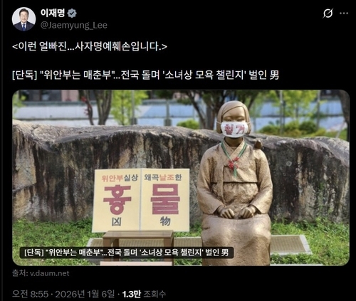 일본군 위안부 피해자를 성매매 여성으로 비난하며 소녀상 철거를 요구하는 시위에 대해 이재명 대통령이 6일 "얼빠진 사자명예훼손"이라고 강하게 비판했다.