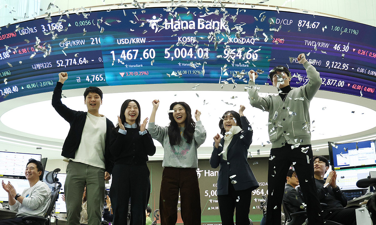 22일 오전 서울 중구 하나은행 본점 딜링룸 현황판에 코스피 지수가 장중 5000p를 넘으며 개장하자 직원들이 환호하고 있다.