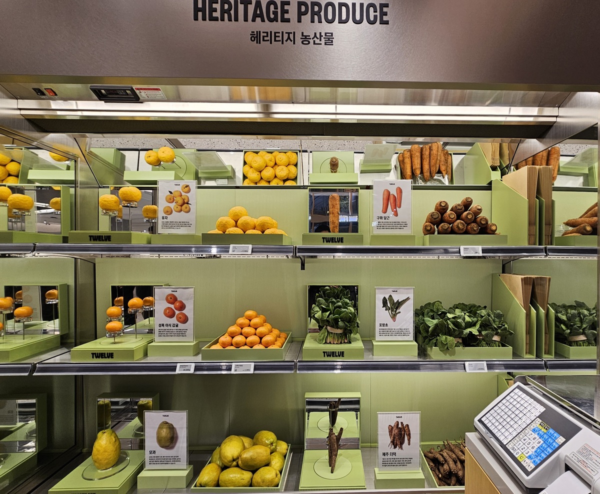 핵심 공간인 트웰브는 마치 의류 매장을 보는 듯했다. 대표 상품은 별도로, 상품의 색상과 소재는 시각적으로 눈에 띄게 진열돼 있었다. 식품 매장에 이 같은 방식을 도입한 국내 첫 번째 매장이다. 레몬이나 당근 같은 색색깔의 과일, 채소 품목의 대표 상품 한 점을 단독 진열하는 쇼케이스 방식을 도입해 상품의 질감과 퀄리티를 직관적으로 확인할 수 있었다. 집기는 목재 결을 살린 특수 마감과 메탈 소재를 조합해 패션 편집숍 느낌을 살렸다.