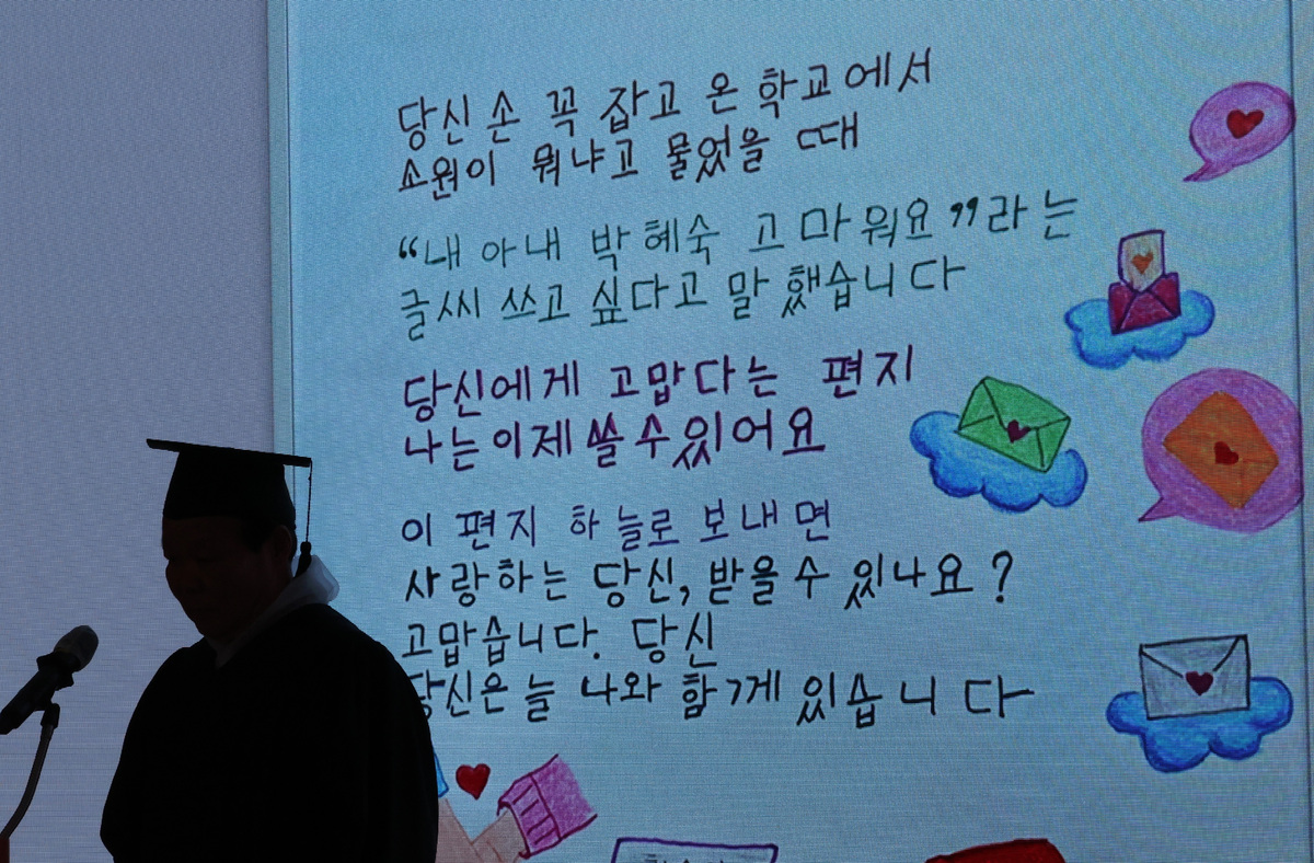 28일 서울 영등포구 영등포구청 별관에서 열린 2025학년도 영등포늘푸름학교 졸업식에서 졸업가운과 학사모를 착용한 한 어르신이 아내에게 보내는 편지를 읽고 있다. 늘푸름학교는 초등 중학 학력을 인정받는 성인문해학교다.