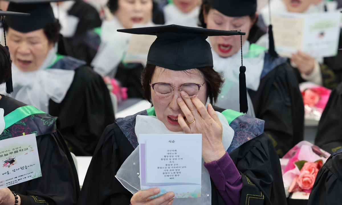 28일 서울 영등포구 영등포구청 별관에서 열린 2025학년도 영등포늘푸름학교 졸업식에서 졸업가운과 학사모를 착용한 어르신들이 눈물을 흘리고 있다. 늘푸름학교는 초등 중학 학력을 인정받는 성인문해학교다.