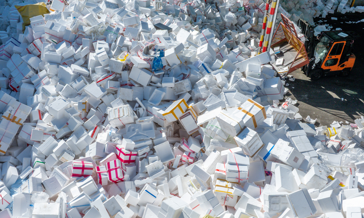 설 연휴 이후 첫 평일인 19일 명절 선물을 감싸던 스티로폼이 한데 쌓여 마치 하얀 산처럼 보인다.