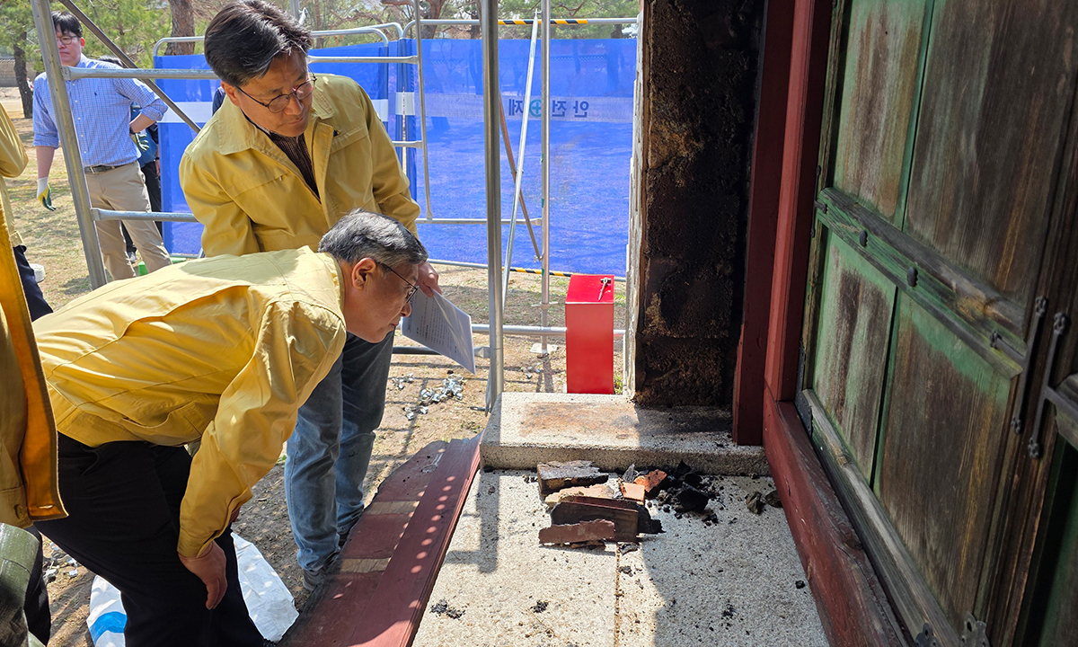 지난 28일 오전 5시30분쯤 경복궁 근정전 인근 자선당 삼비문 쪽문에 화재가 발생해 15분 만에 진화했다. 허민 국가유산청장이 화재 현장을 살펴보고 있다. 국가유산청 제공