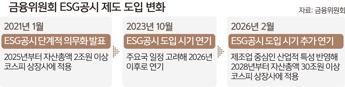 그러나 금융위는 ESG공시 의무화 제도 시행을 2026년에서 2028년으로 늦추고 공시대상 기업도 자산총액 2조원에서 30조원으로 축소하는 안을 추진 중이다.