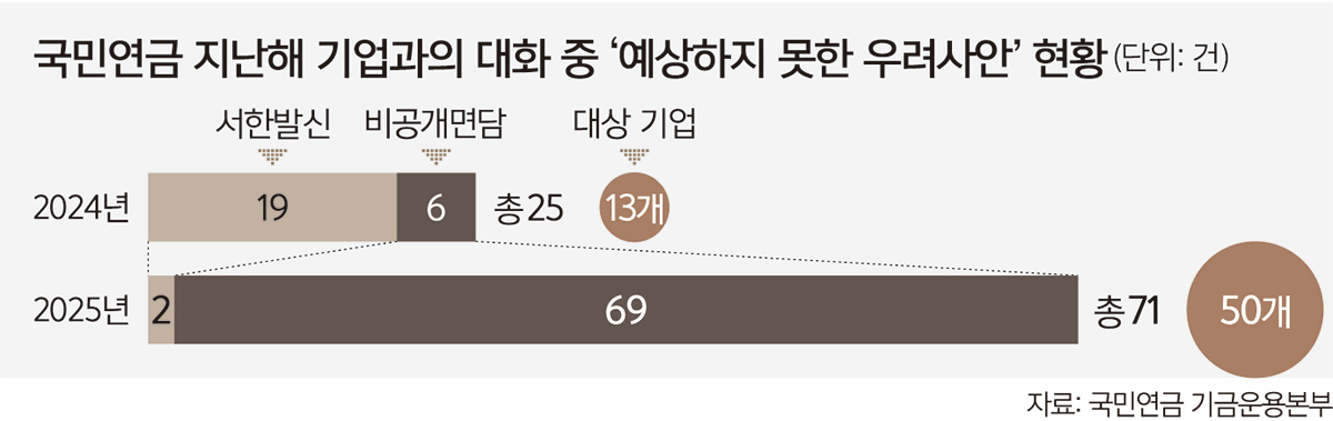 문제는 지난해 예상하지 못한 우려사안이 크게 늘어났다는 점이다. 국민연금이 재작년 주주활동을 벌인 상장사 수는 13곳이었지만 지난해에는 이보다 285% 증가한 50곳으로 늘었다. ESG에 문제 있는 상장사 수가 늘면서 국민연금의 비공개면담 건수도 폭증했다. 지난해 국민연금은 50곳 상장사를 대상으로 69건의 비공개면담을 진행했다. 이 역시 전년(6건) 대비 1050% 증가한 수치다. 2022년 11건, 2023년 12건과 비교해도 크게 늘었다.