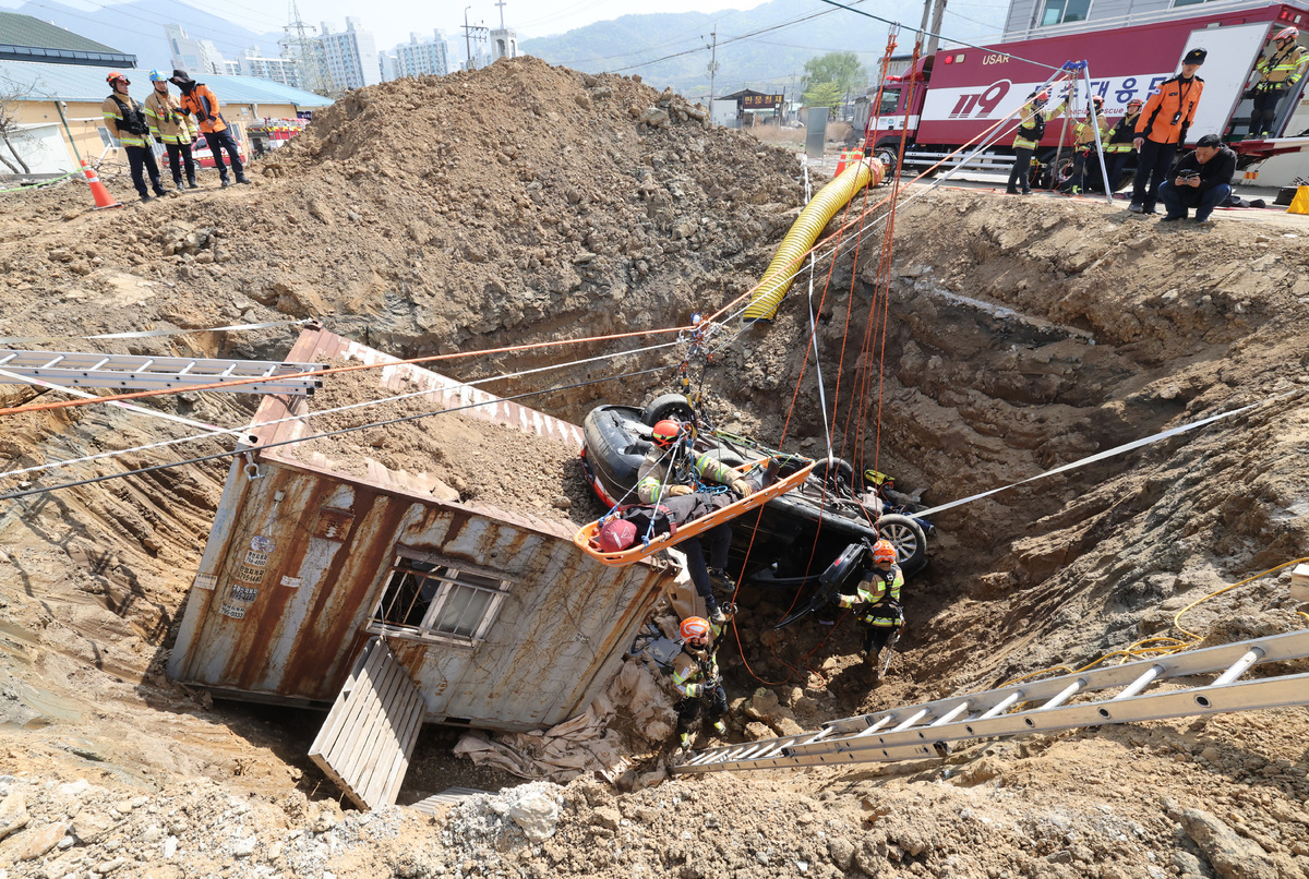 싱크홀 구조훈련 15일 경기도119특수대응단 구조대원 등이 경기 하남시 교산 공공주택지구에서 진행된 ‘2026년 중대 재난 대응 유관기관 합동훈련’에서 싱크홀(땅꺼짐) 발생에 따른 차량 등 매몰 상황을 가정한 구조훈련을 하고 있다. 하남=이제원 선임기자