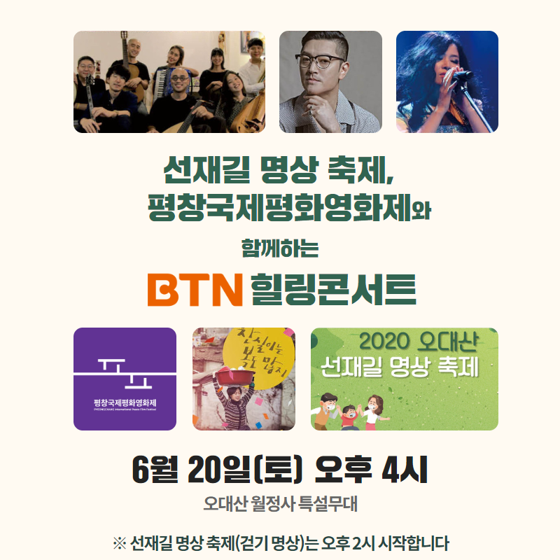 지난 18일 BTN불교TV(대표이사 구본일) 측은 “20일 오대산 특설무대에서 ‘2020오대산선재길명상축제’, ‘평창국제평와영화제’와 함께 ‘BTN힐링콘서트’를 개최한다”고 전했다.