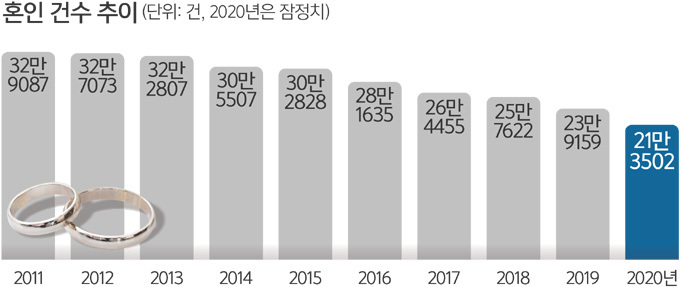 혼인건수가 급감한 것은 결혼에 대한 가치관이 변화하는 상황에서 코로나19의 충격이 겹친 데 따른 것으로 풀이된다.
