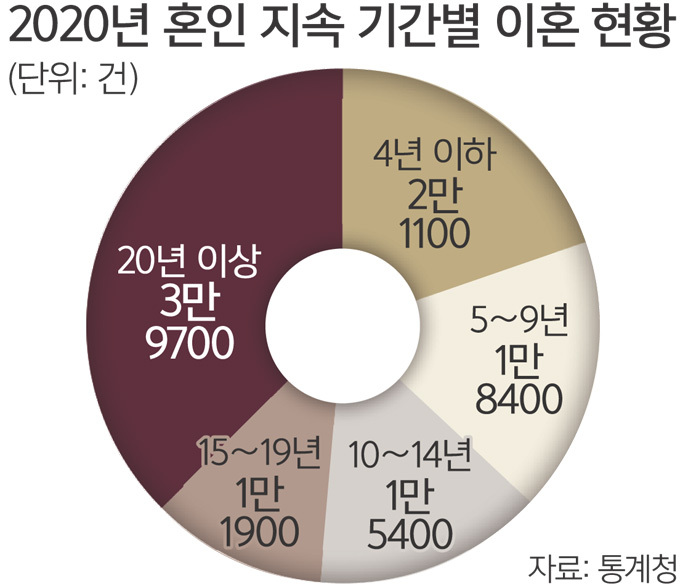 다만 ‘황혼이혼’ 증가세는 계속됐다. 혼인 지속 기간 20년 이상 이혼이 3만9700건으로 전체 이혼의 37.2%를 차지해 비중이 가장 컸고, 다음으로 4년 이하 이혼이 2만1100건으로 19.8%였다.