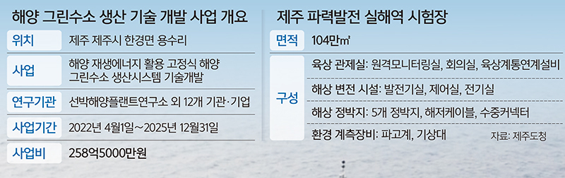 지난달 26일 제주파력발전 실해역 시험장을 찾았다. 제주 한경면 용수리 해안가에서 보이는 가로 10m, 세로 32m, 높이 23m 크기의 콘크리트 구조물은 아시아 최초 5㎿(메가와트)급 해양 그린수소 생산시설이다. 250㎾(킬로와트)급 발전시설과 제어실 등을 갖추고, 연간 120가구가 사용할 수 있는 전력을 생산한다. 지난해 말 설치를 마치고 올해 생산기술 실증을 진행 중이다.