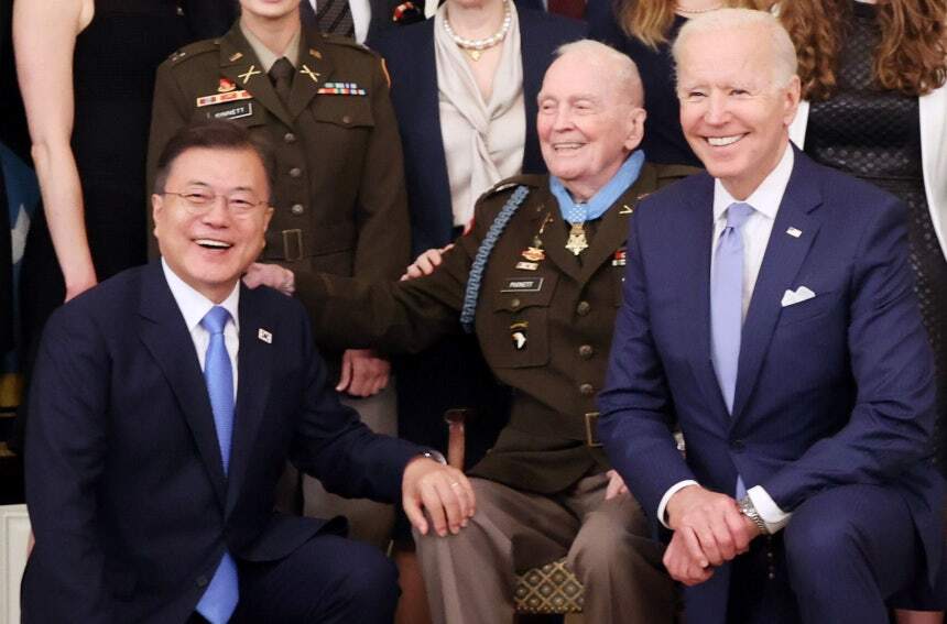 2021년 미국 백악관에서 6·25 전쟁 참전용사 랠프 퍼켓 주니어 전 육군 대령(가운데)에 대한 명예훈장 수여식 직후 당시 조 바이든 미국 대통령(오른쪽부터), 퍼켓 대령, 문재인 대통령이 기념촬영을 하고 있다. 세계일보 자료사진