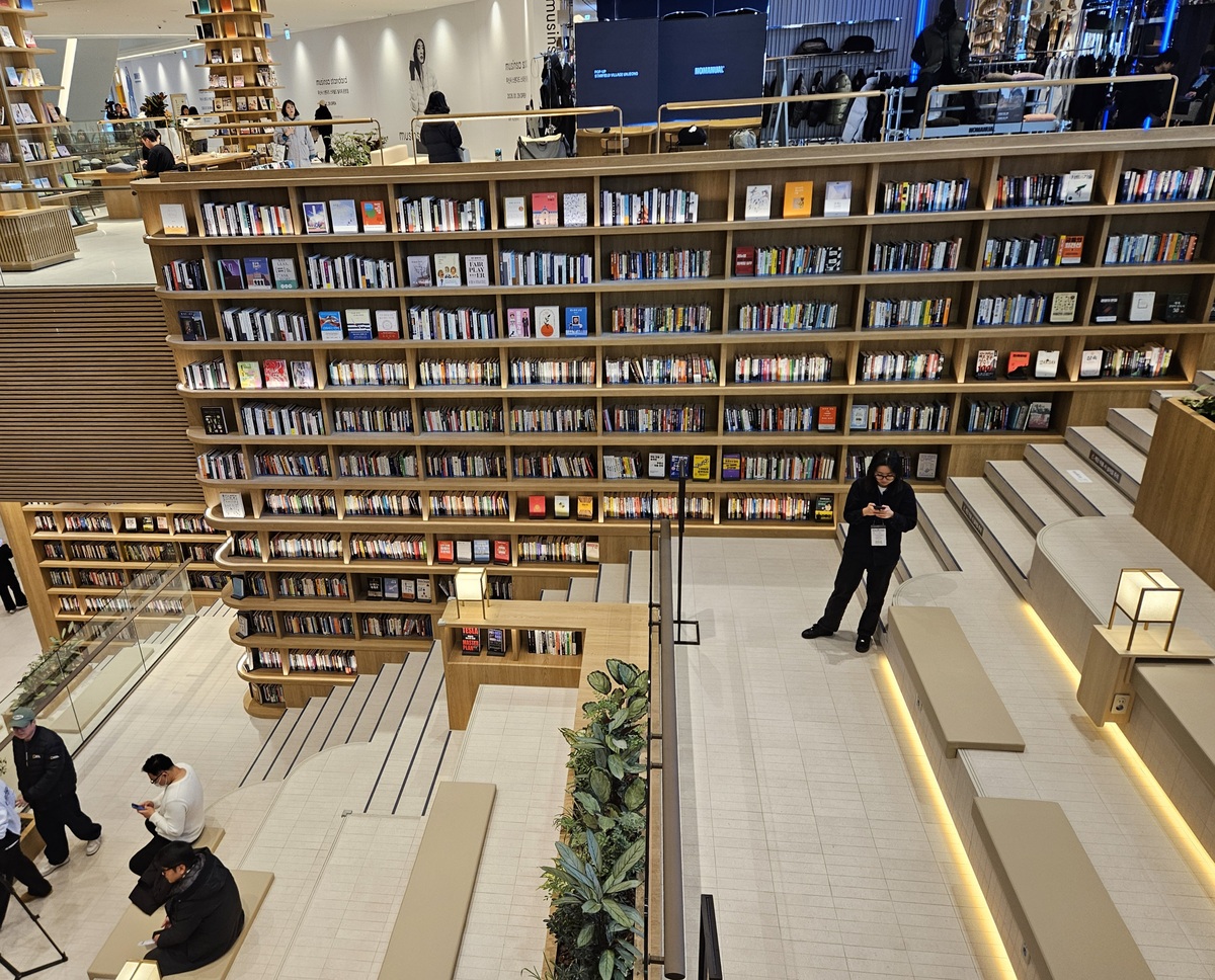 먼저 1~2층 중심부에는 휴식 공간인 ‘센트럴 파드’와 계단형 라운지 ‘북스테어’가 크게 자리하고 있었다. 스타필드 빌리지 운정의 핵심 공간으로, 총 3만6000여권의 책이 둘러싼 복층형 서가와 라운지에서 커피·독서·휴식·대화가 어우러졌다. 중앙에는 층별로 카페 ‘인크커피’와 ‘어반플랜트’가 입점해 책과 함께 브런치를 즐길 수 있도록 했다. 북스테어에서는 자유롭게 앉아 대화를 나누거나 가볍게 책을 읽는 이들의 모습이 보였다. 4층과 5층의 야외 ‘옥상정원’은 사계절의 변화를 느낄 수 있는 식재와 조경으로 도심 속 휴식처를 제공한다.