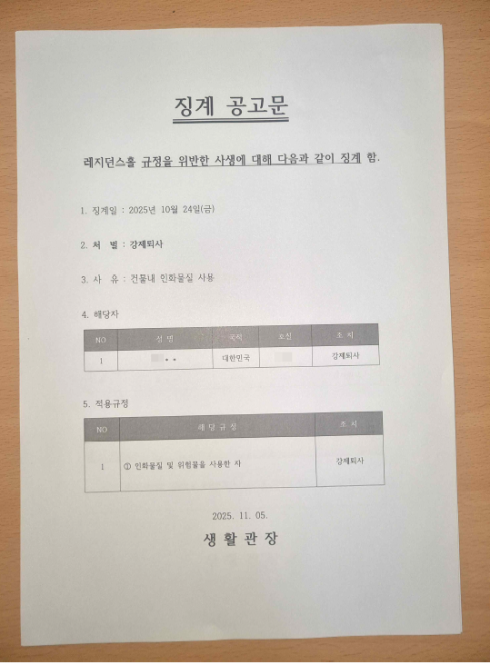 15일 교육계에 따르면 최근 숭실대 레지던스홀 기숙사에는 규정을 위반한 학생 두 명에 대한 징계 공고가 게시됐다. 해당 학생들은 생활관 내 흡연이 적발돼 기숙사에서 강제 퇴사 처분을 받았다.