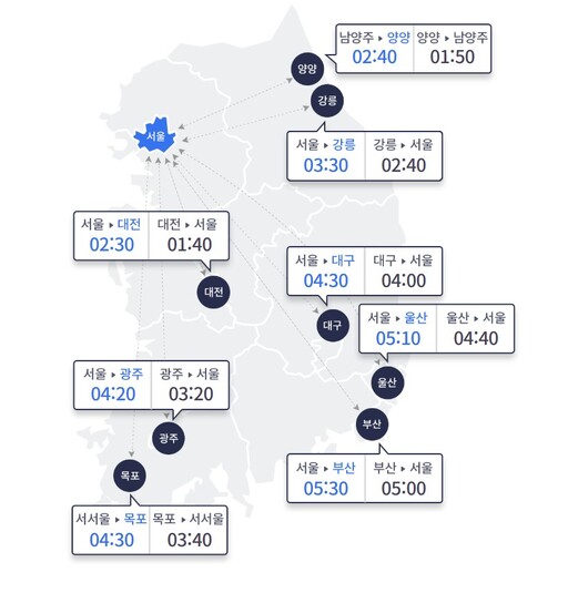 상행선은 ▲부산~서울 5시간 ▲대구~서울 4시간 ▲광주~서울 3시간20분 ▲대전~서울 1시간40분 ▲강릉~서울 2시간40분 ▲울산~서울 4시간40분 ▲목포~서서울 3시간30분이다.