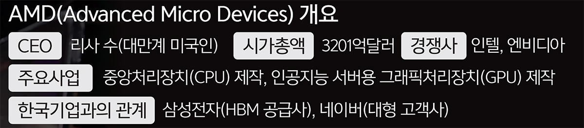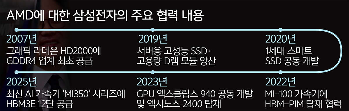 18일 한국에 온 리사 수 CEO는 이재용 삼성전자 회장과 만찬을 하며 글로벌 AI 시장에서 양사의 협력 강화 방안 등을 논의했다. 2014년 AMD CEO에 취임한 후 처음 방한한 그는 앞서 첫 행선지로 경기 성남 네이버 본사를 찾아 최수연 대표와 만난 후 삼성전자 평택 캠퍼스를 찾았다. 평택 공장을 둘러본 수 CEO는 삼성전자 반도체 사업 수장인 전영현 삼성전자 DS부문장을 만나 차세대 AI 메모리, 컴퓨팅 기술 분야 협력을 확대하는 업무협약(MOU)을 체결했다. 삼성전자와 AMD는 HBM4(차세대 고대역폭메모리) 생산부터 메모리 위탁생산(파운드리)까지 함께하는 동맹으로 거듭난 것이다.
