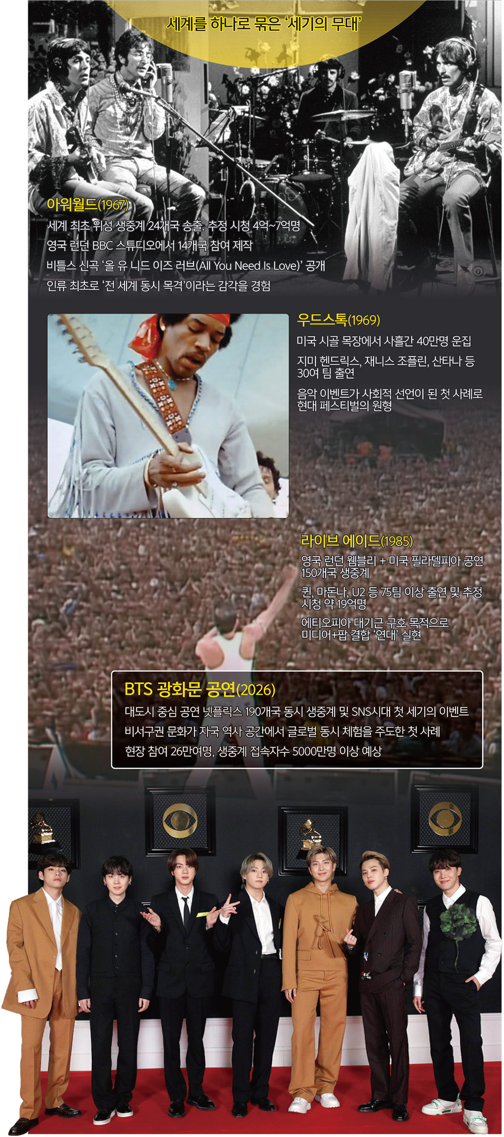 1969년 우드스톡 페스티벌은 ‘평화’, 1985년 라이브 에이드는 ‘연대’의 중요성을 동시대 사람들에게 일깨웠다. 2026년 방탄소년단(BTS)의 ‘BTS 더 컴백 라이브 | 아리랑’은 어떤 유산을 남긴 축제로 기록될까.
